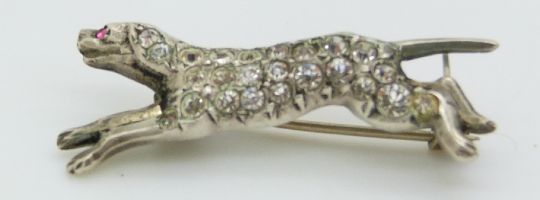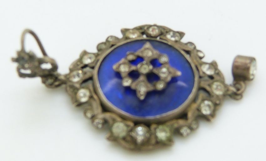 Victorian pendant set with guilloché enamel and paste, a Victorian brooch in the form of a dog set with paste and a Victorian mourning ring