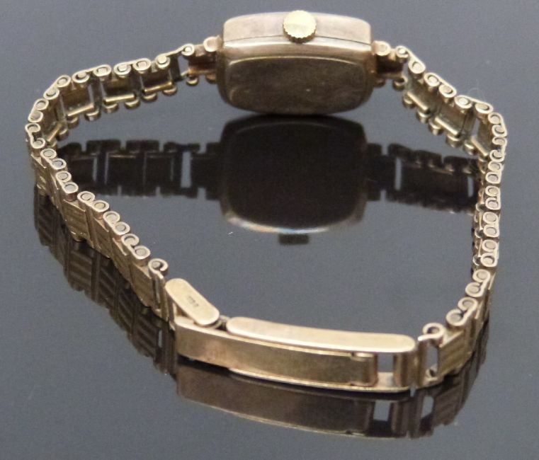 Invicta 9ct gold ladies wristwatch with gold hands and hour markers, textured silver dial, and later quartz movement, on 9ct gold bracelet, case diameter 15mm, 13.5g