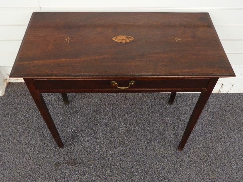 Georgian mahogany side table, the top inlaid with a shell flanked by two eight-point stars, the single central drawer with brass drop handle, 88 x 43 x 72cm