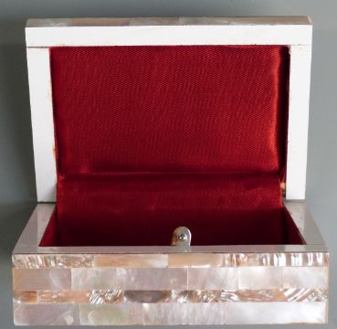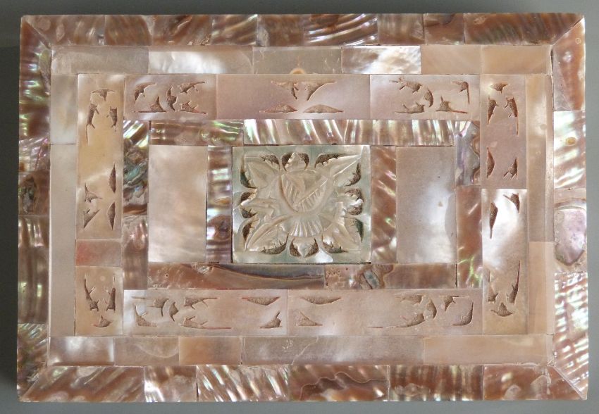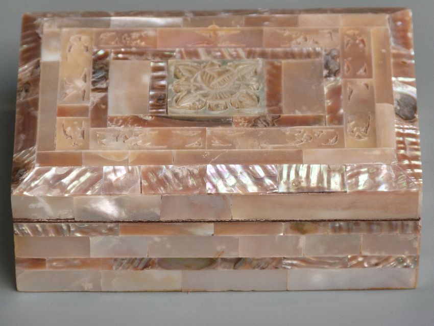 A mother of pearl box with pierced and carved decoration, approximately 13 x 9 x 4cm