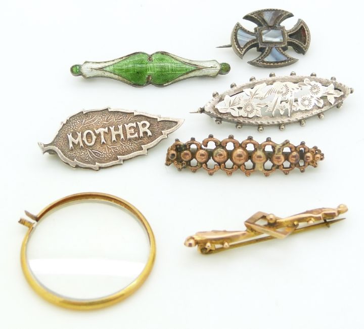 A 9ct gold locket, gold brooch (0.9g), silver brooches etc