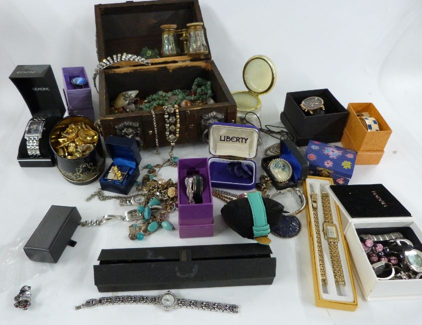 A collection of costume jewellery including agate, watches, rings, opera glasses etc