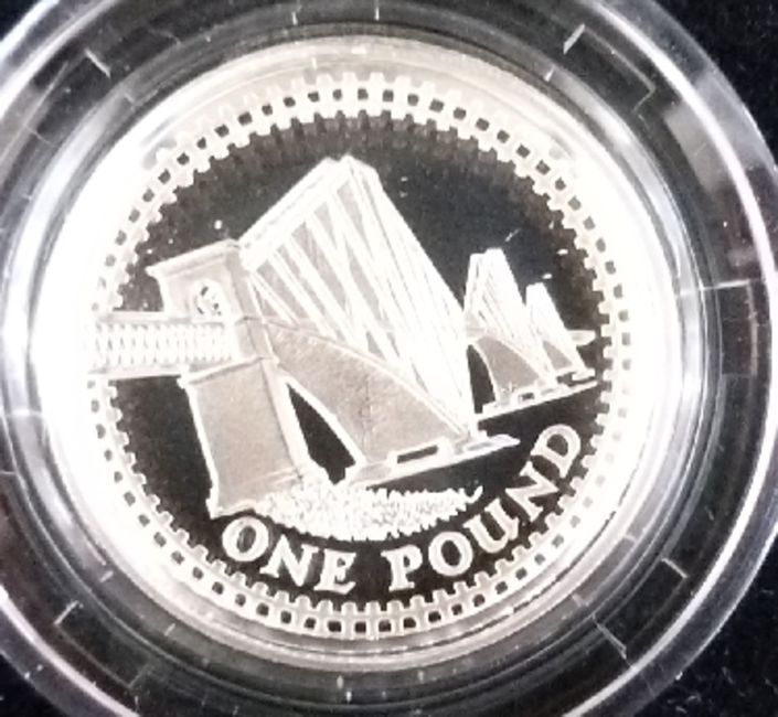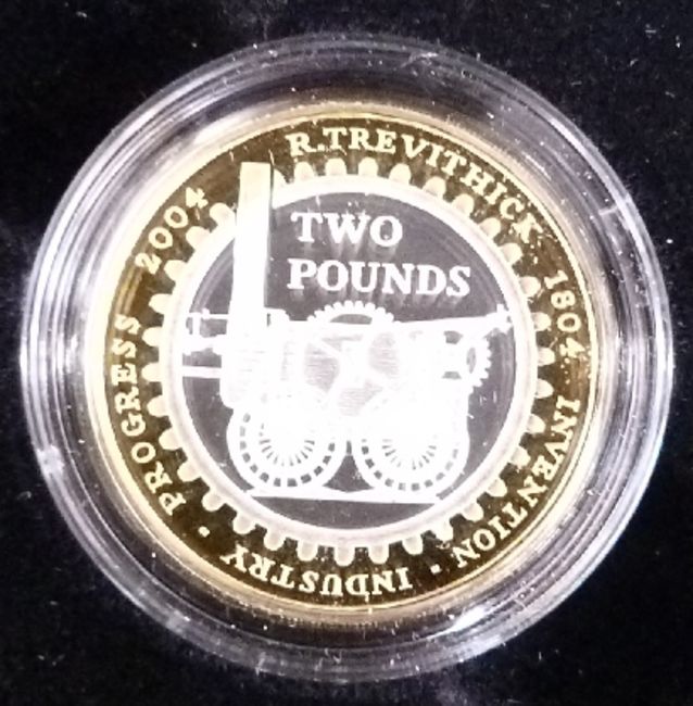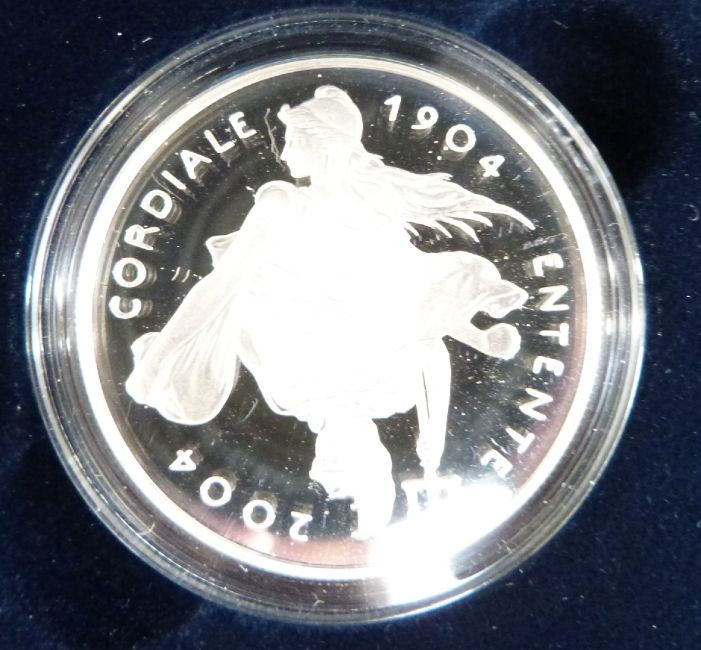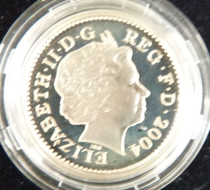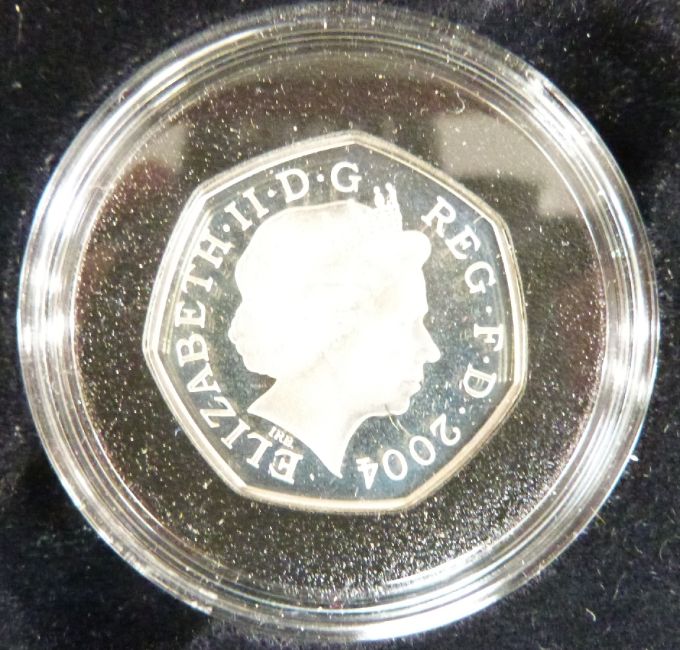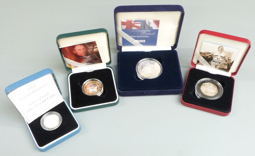 2004 Royal Mint silver proof cased coins comprising Entente Cordiale crown, Trevithick £2, Forth Rail Bridge £1 and a Roger Bannister fifty pence, all with certificates