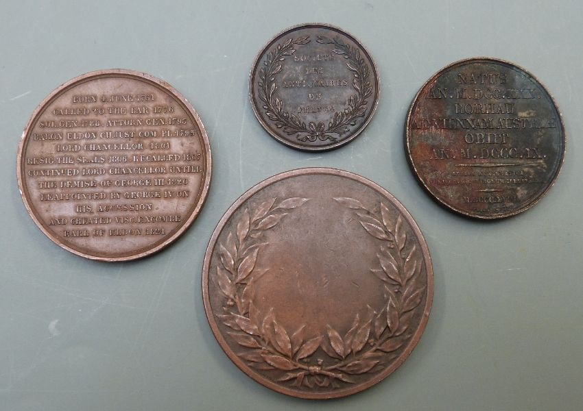 Four 18th, 19th and early 20thC bronze coin medals, John, Earl of Eldon, Josephus Haydn, etc