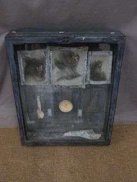Glazed wall hanging display of lead items including cutlery, lead framed monochrome pictures etc, 82 x 67cm overall