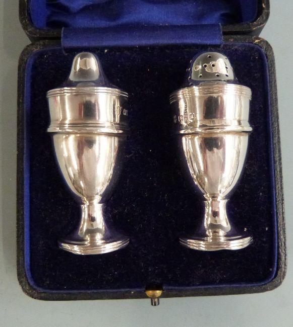 Cased set of hallmarked silver teaspoons and a cased hallmarked silver salt and pepper, weight 140g