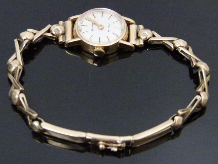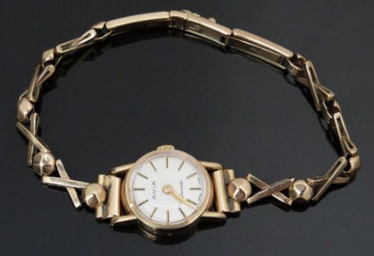 Avia 9ct gold ladies wristwatch with gold hands, two-tone baton markers, silver dial and quartz movement, on 9ct gold bracelet, case diameter 16mm, 11g