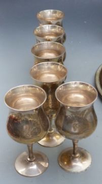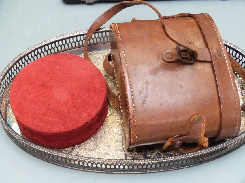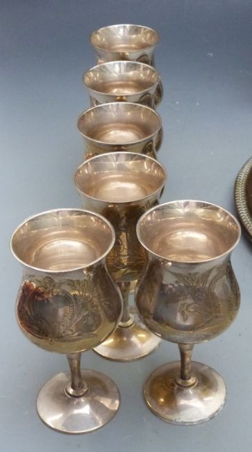 Silver plated ware to include large Spear & Jackson tray, goblets, drawing set, binoculars etc