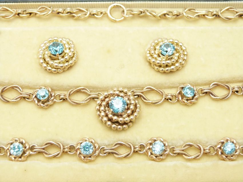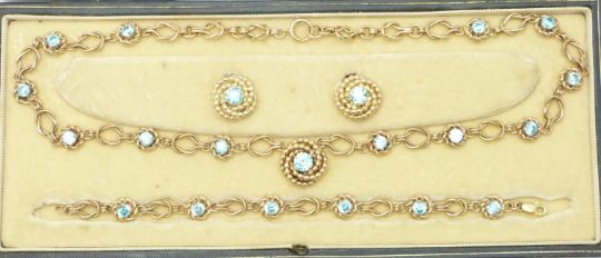 A suite of 9ct gold jewellery made up of knotted and textured links comprising necklace, earrings, and bracelet all set with round cut zircons, 55.8g