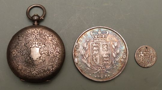 A quantity of silver coins to include Queen Victoria 1845 crown, 1787 George III Spanish coin (holed) and a silver pocket watch hallmarked Birmingham
