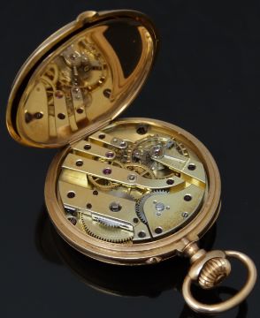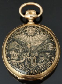 Swiss 18ct gold gentleman's keyless winding open faced pocket watch with inset subsidiary seconds dial, black Roman numerals, blued hands, white enamel dial and enamel case back with Swiss mountain scene, case diameter 51mm, serial number 12385, 95.3g