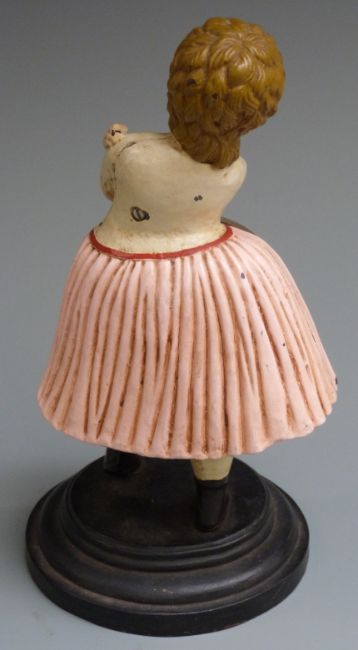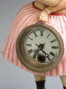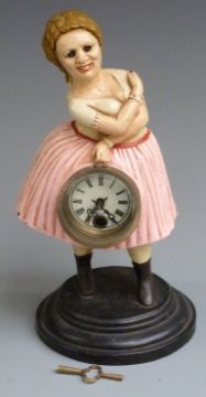 Cast iron figural clock in the form of a lady holding a clock, with automaton moving eyes, 30cm tall