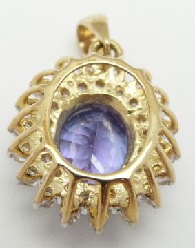 A 9ct gold pendant set with an oval cut tanzanite surrounded by diamonds
