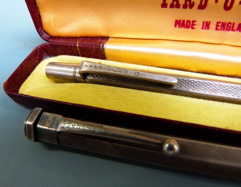 Two silver Yard O Led propelling pencils, one in original box with instructions.