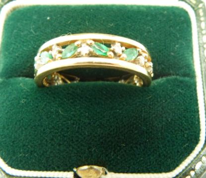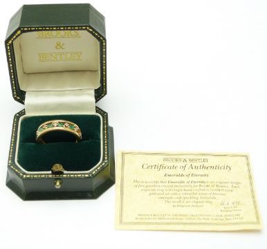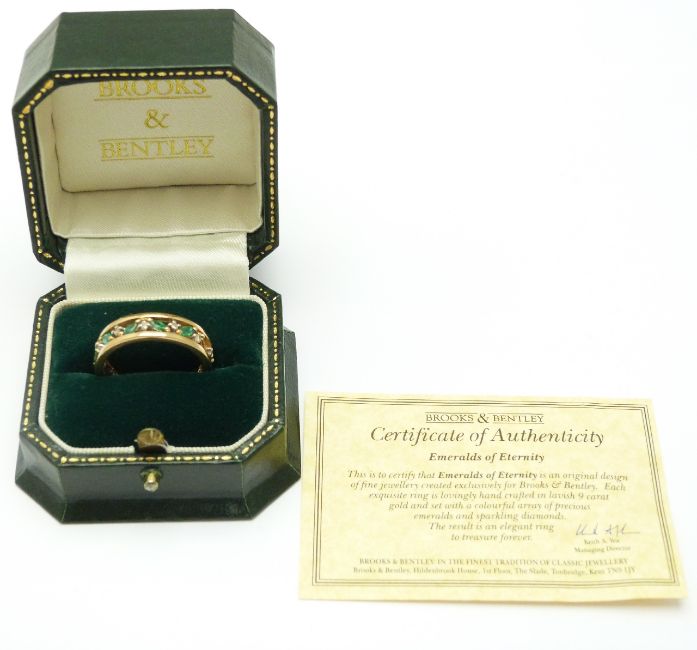 A 9ct gold eternity ring set with marquise cut emeralds and diamonds, in original Brooks & Bentley box, 4.7g, size T