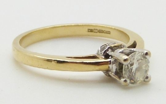 An 18ct gold ring set with a round brilliant cut diamond measuring approximately 0.3ct with further diamonds to the setting, 3.5g, size M/N