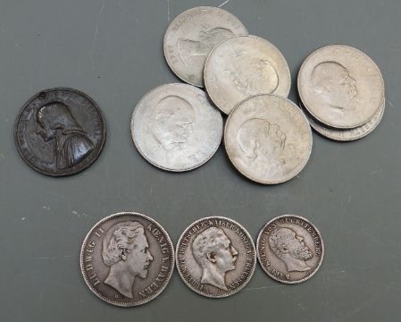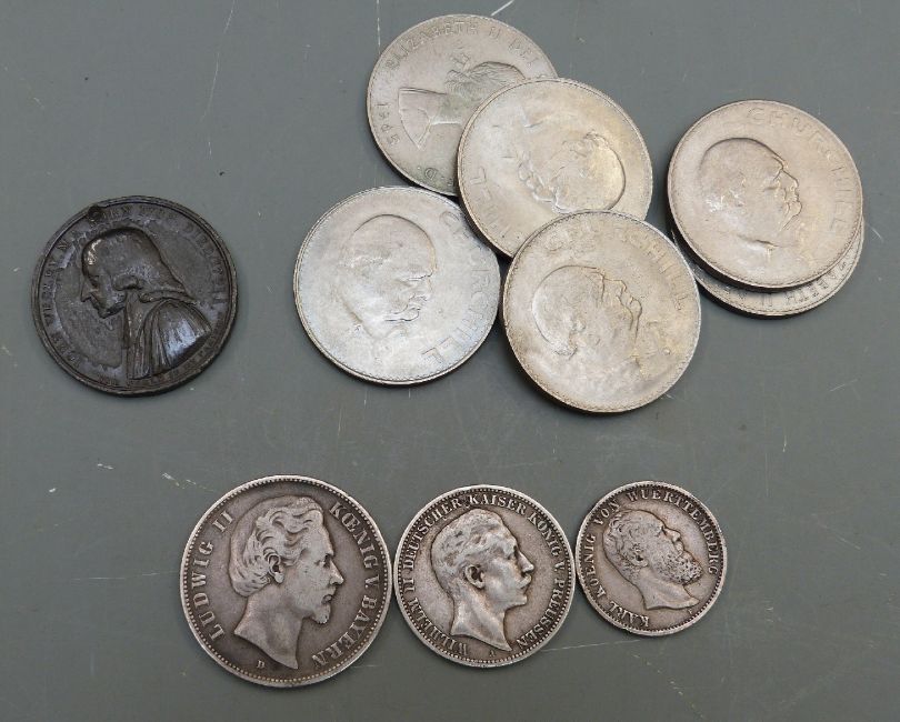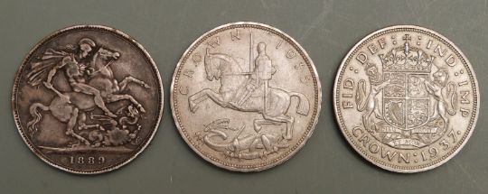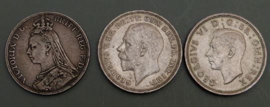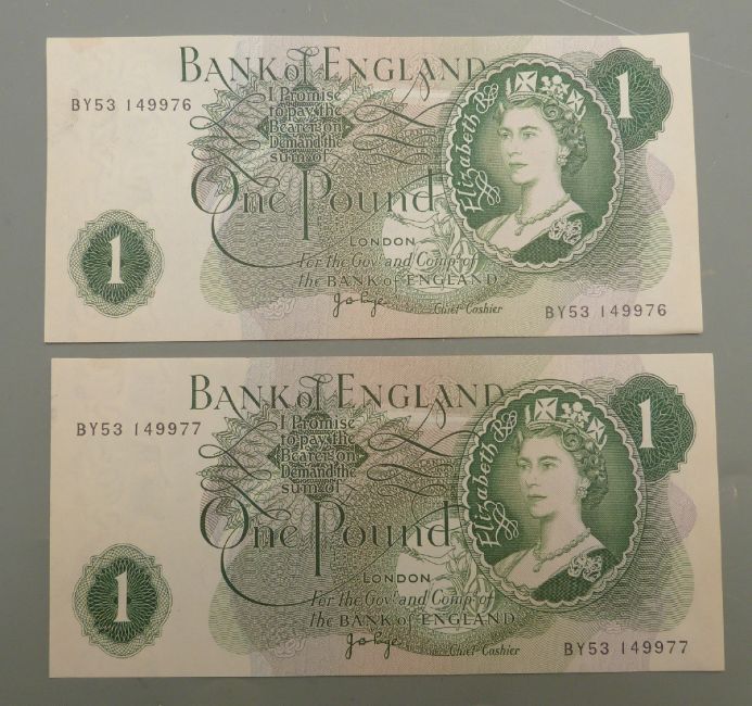 An amateur collection of coins to include Victorian crowns, modern cased silver crowns, UN Peace Medal coin, banknotes including a consecutive pair of uncirculated J B Page one pound notes