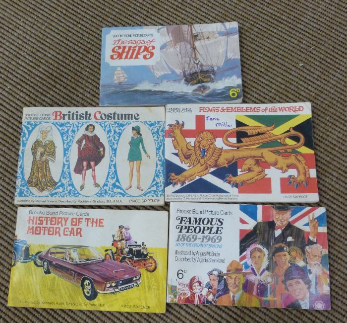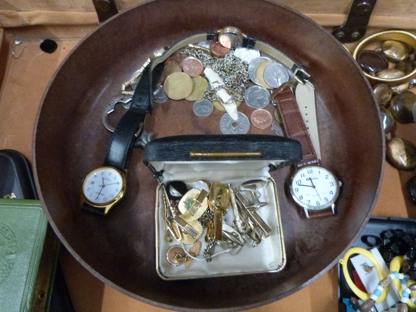 Brown briefcase including tea cards, watches, jewellery, coins etc