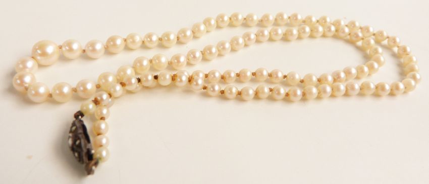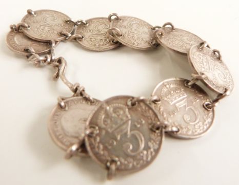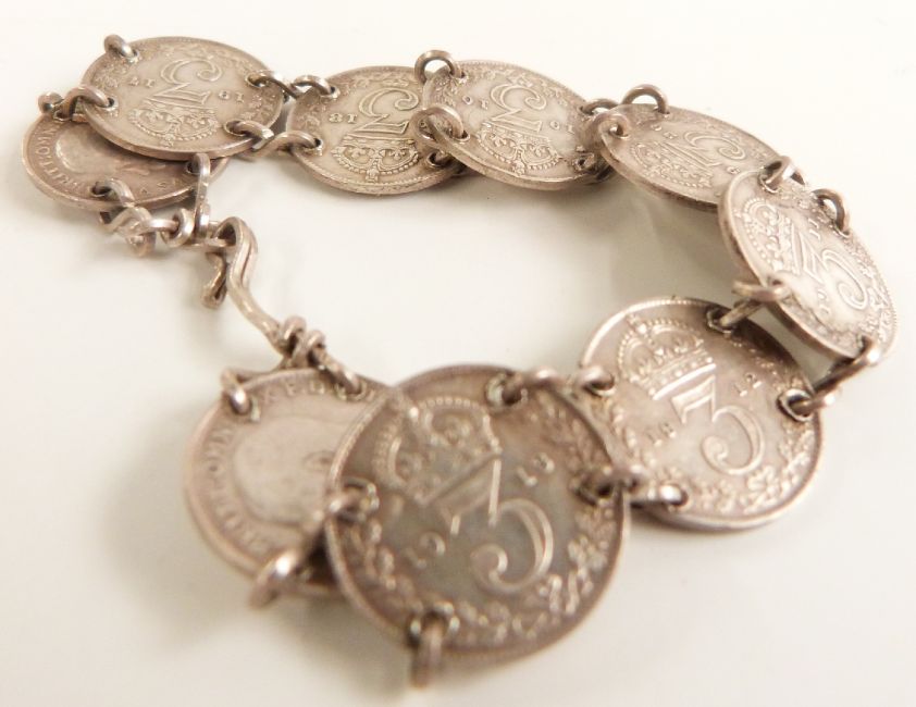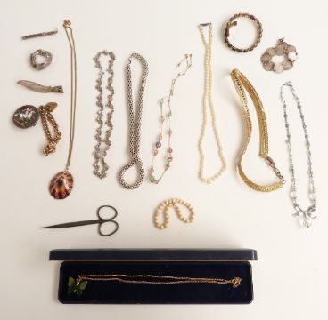 A collection of jewellery including enamelled crown, pearl necklace, silver necklace, silver threepence bracelet, silver pencil etc