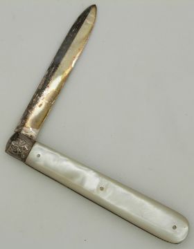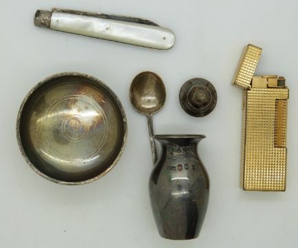 Dunhill gold plated lighter, Victorian fruit knife with hallmarked silver blade and mother of pearl handle (Sheffield 1892), hallmarked silver pepper pot and salt (Edinburgh 1926) and a hallmarked silver mustard spoon