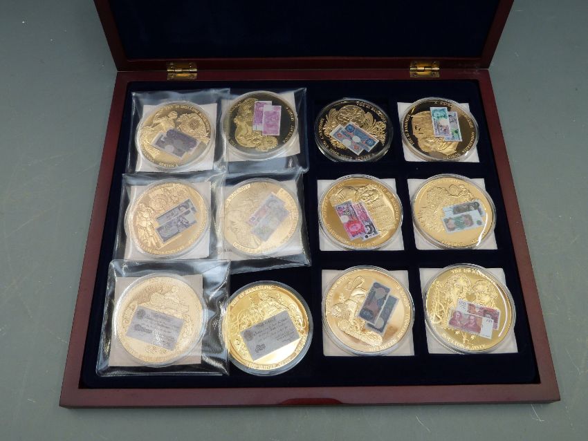 British banknotes GP Commemorative coin collection comprising twelve 50mm gold plated copper coins decorated with a banknote image, in collector's case, most with certificates