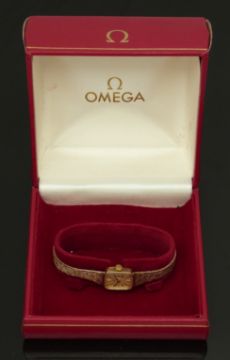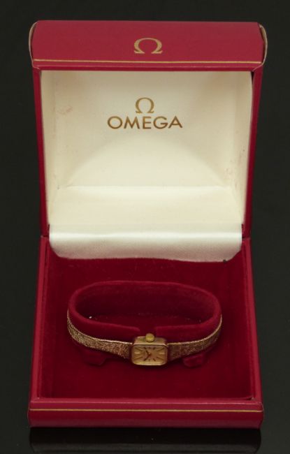 Omega 9ct gold ladies wristwatch with two tone hands and baton markers, gold dial and signed 17 jewel calibre 485 movement, on integral 9ct gold bracelet, case diameter 14mm, serial number 7115686, 19.5g, in original box
