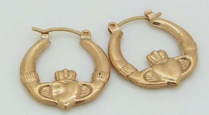 Two pairs of 9ct gold earrings one pair depicting the Claddagh symbol, 2g