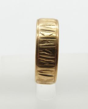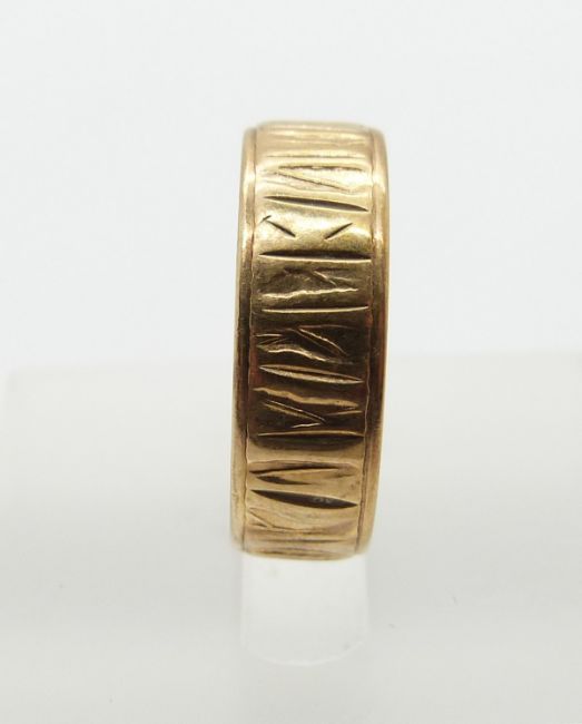 A 9ct gold wedding band with textured detail, size L, 2.9g.
