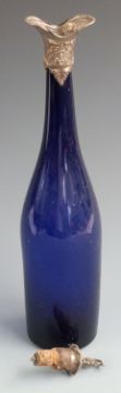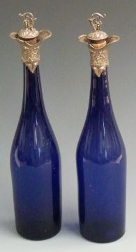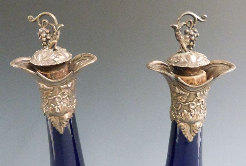 Pair of Victorian Bristol blue glass decanters with hallmarked silver mounts and stopper, Sheffield 1838 maker Thomas Bradbury & Son, height 40cm