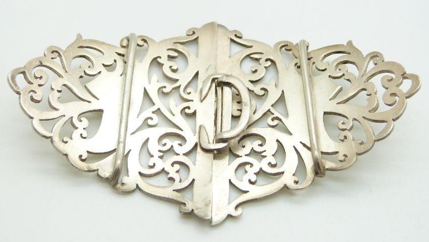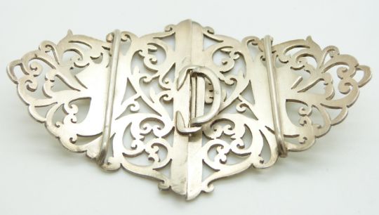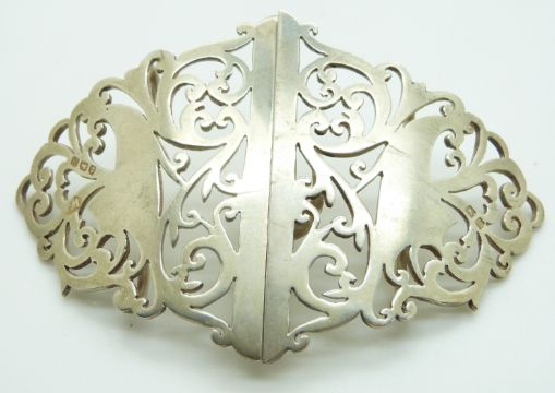 George V hallmarked silver buckle with scrolling decoration, Birmingham 1911 maker's mark indistinct, width 10cm