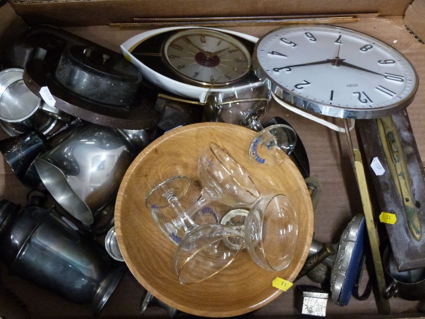 Plated cocktail shaker, treen bowl, trench art, three retro Metamec clocks, two pairs of binoculars, retro magazine rack etc