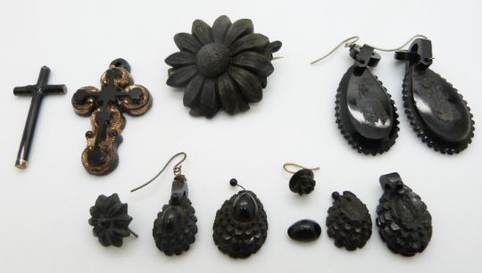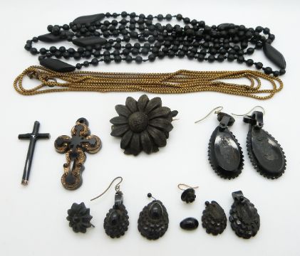 A quantity of Victorian jet earrings, jet brooch, gilt guard chain etc