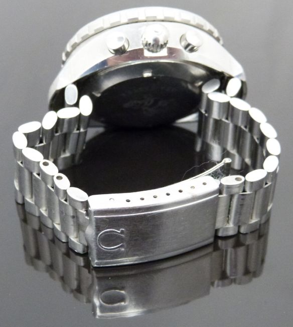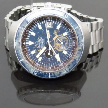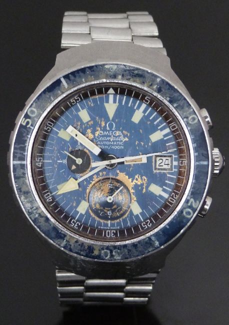 Omega Seamaster 'Big Blue' gentleman's automatic chronograph diver's wristwatch ref. 176.004 with blue 'tropical' dial, date aperture, subsidiary dials recording continuous seconds, 24 hours and chronograph 60 minutes, luminous white hands, yellow arrow shaped centre 60 minute hand, rotating blue bezel, stainless steel case and 22 jewel calibre 1040 movement, on stainless steel bracelet, case diameter 44mm, serial number 34255688, 1972.