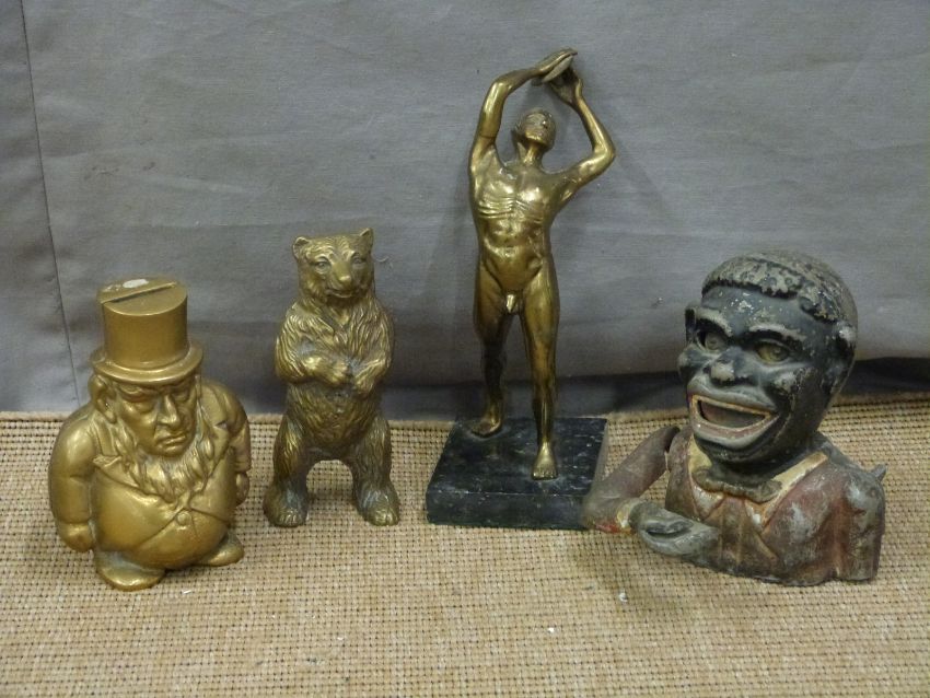 Bronze or similar figure of a discus thrower on marble plinth, height 23cm, and three novelty money boxes