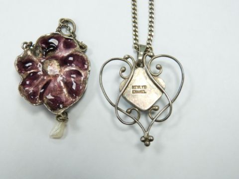 Arts & Crafts pendant set with enamel and pearls, 5 x 2.5cm and a Newlyn enamel Arts and Crafts pendant, 3 x 3cm
