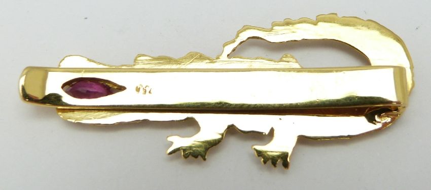 An 18ct gold crocodile clip set with a marquise cut ruby and a diamond eye, 5.8g