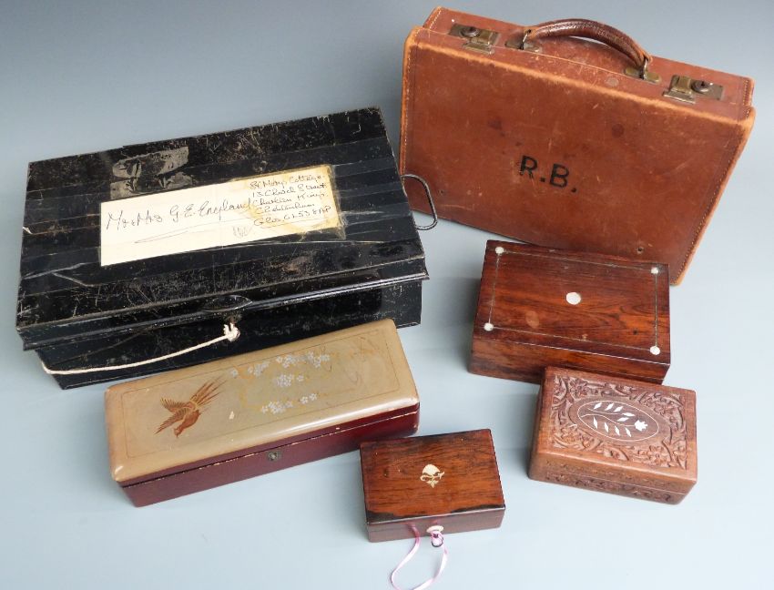 Japanese lacquer box, two Victorian rosewood boxes and a small leather suitcase