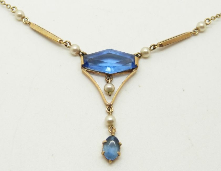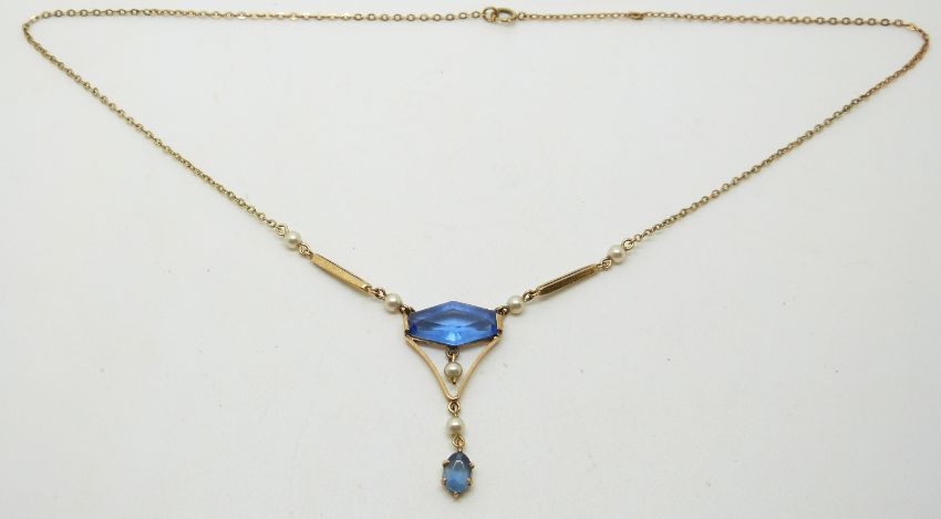 Art Deco 9ct gold necklace set with blue paste and faux pearls, 3.3g
