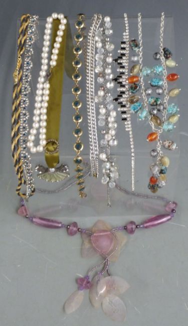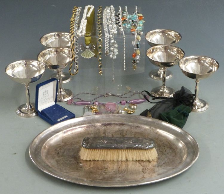 Silver plated tray, set of six goblets, silver mounted brush, costume jewellery etc