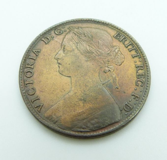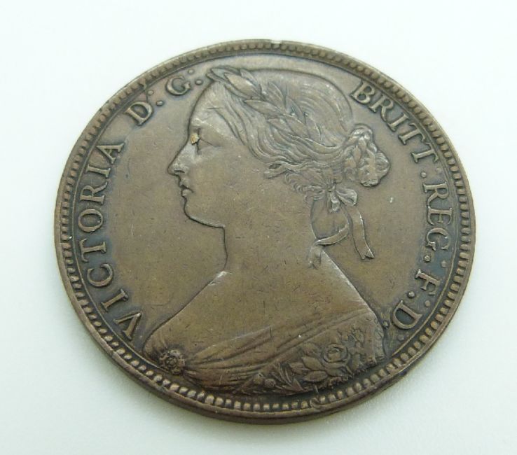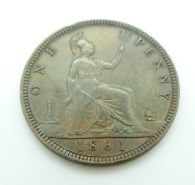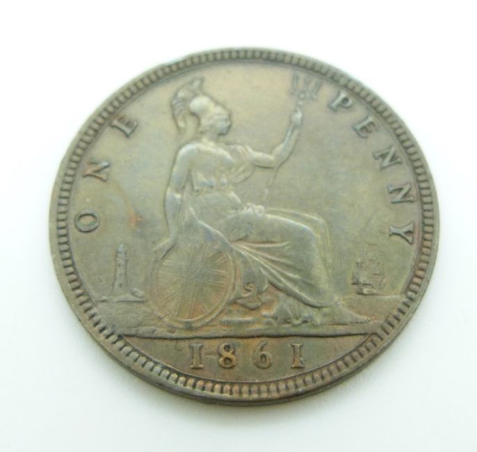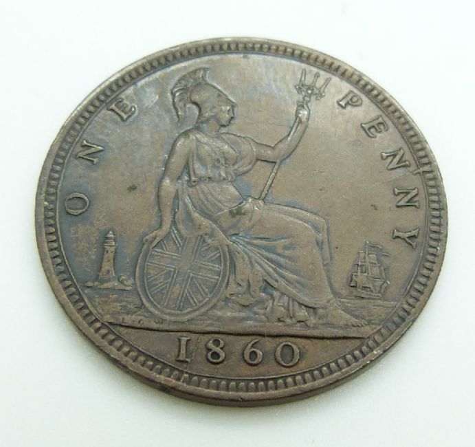 Victoria 1860 young head penny TB, LCW under shield LC Wyon under bust obverse, together with an 1861 example, TB, LCW under shield both, GF-VF