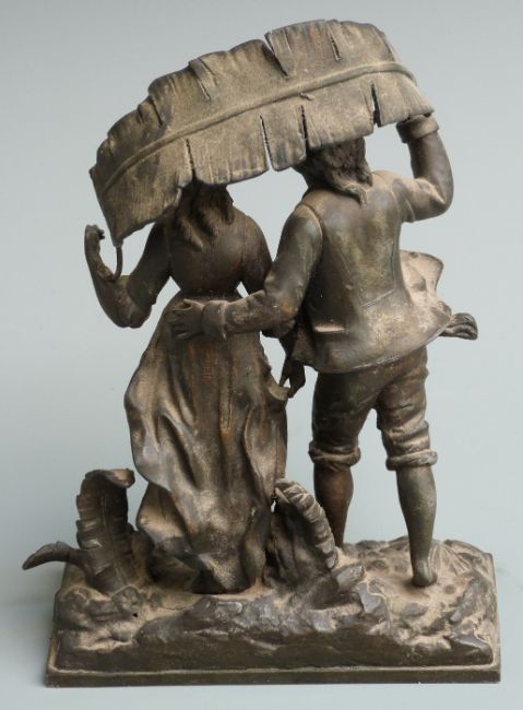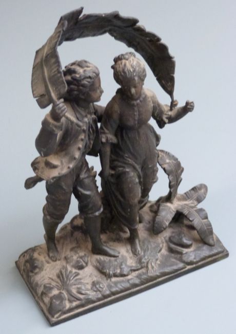 A 19th/20thC spelter figural group of two children using a banana/palm leaf as a sunshade on tropical base, H31cm