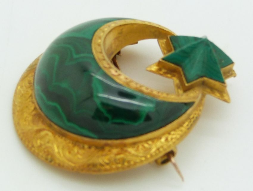 Pair of Victorian paste earrings and a Victorian brooch set with malachite in a crescent and star design, 4cm