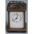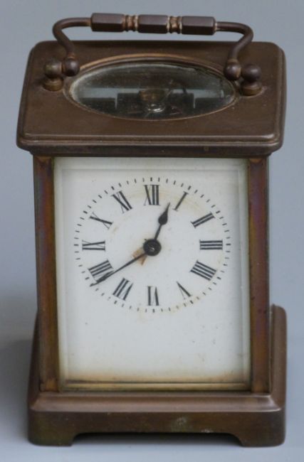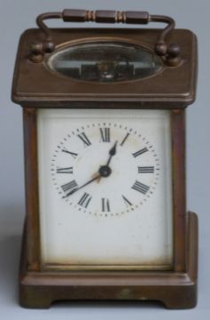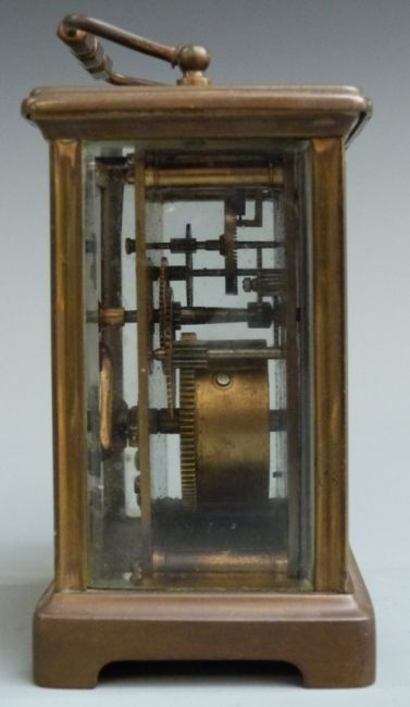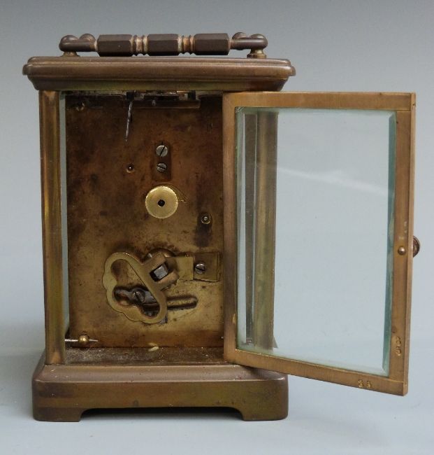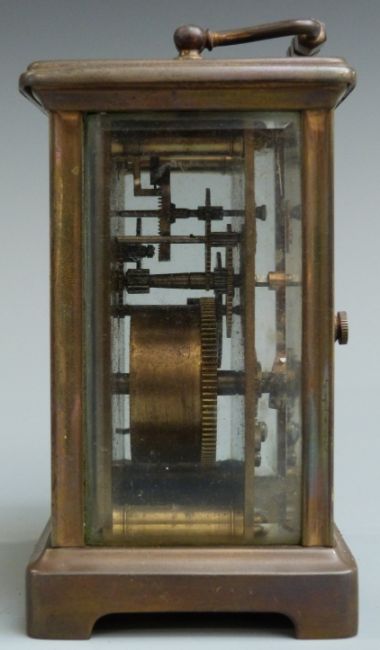 Carriage clock in brass case, the enamel Roman dial with steel hands, the keyless movement visible through bevelled glazed door, striking half hourly on a gong, 11cm tall