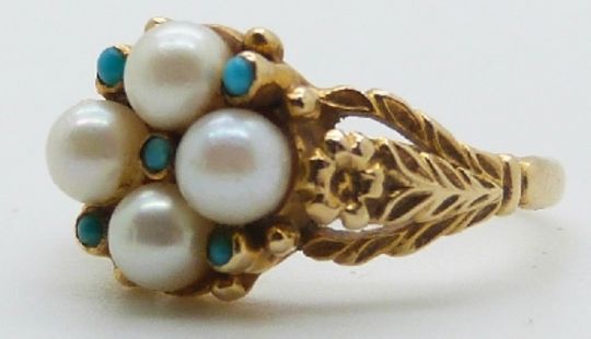A 9ct gold ring set with pearls and turquoise, 3.8g, size N