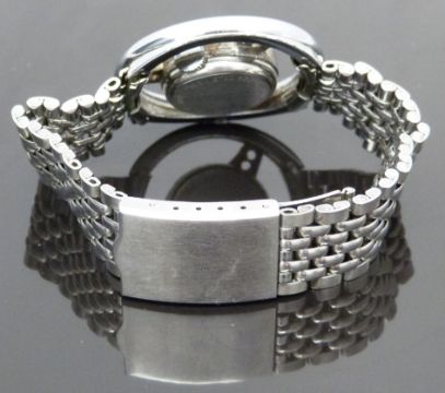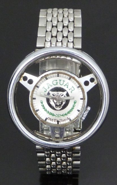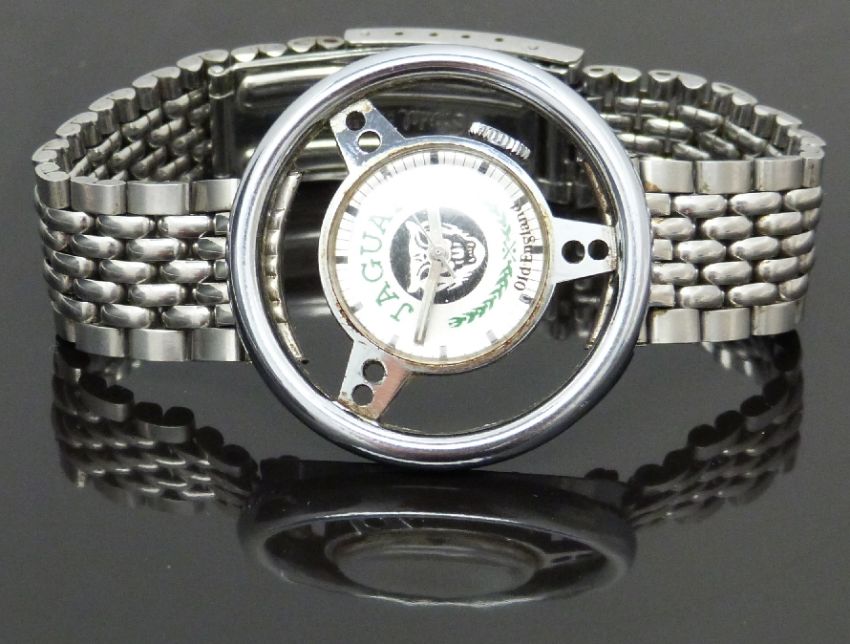 Jaguar Old England gentleman's wristwatch in the form of a steering wheel with luminous hands, Jaguar emblem to the silver dial and signed 1 jewel movement, on stainless steel bracelet, case diameter 39mm.