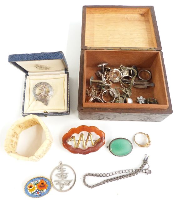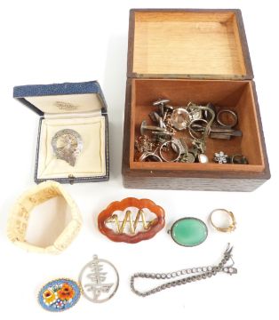 A silver brooch, 9ct gold bracelet (1.8g), 18ct gold earring, silver pendant, silver cufflinks, silver bracelet, vintage jewellery box etc