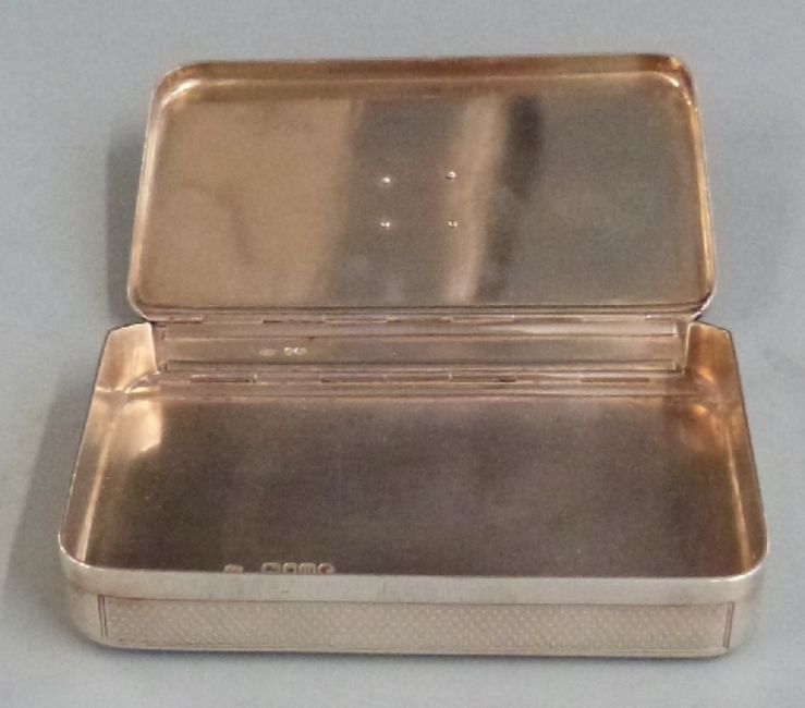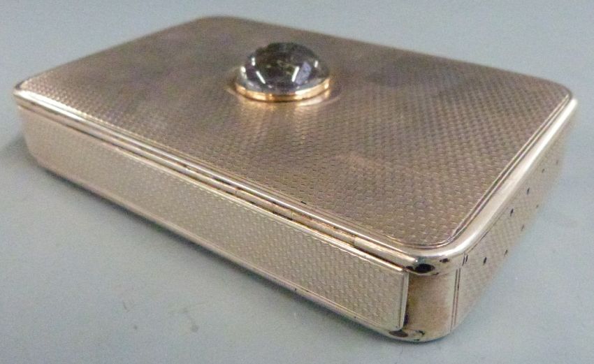 Victorian hallmarked silver sandwich or similar box having engine turned decoration and set with an Essex crystal intaglio depicting a dog held in a gold surround, London 1867, maker Thomas Johnson I, length 12cm weight, 232g all in