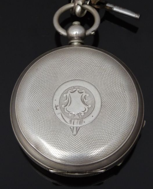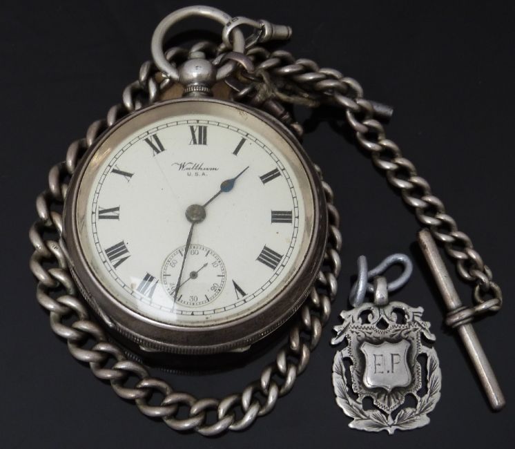 Waltham hallmarked silver open faced pocket watch with inset subsidiary seconds dial, blued hands, black Roman numerals, white enamel dial, engine turned case and signed movement, on hallmarked silver double graduated chain with fob, case diameter 54mm, serial number 20640908.