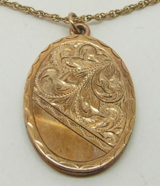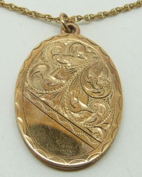 A 9ct gold locket with engraved decoration and chain, 3.5 x 2.5cm, 13.4g