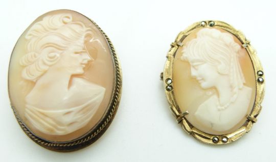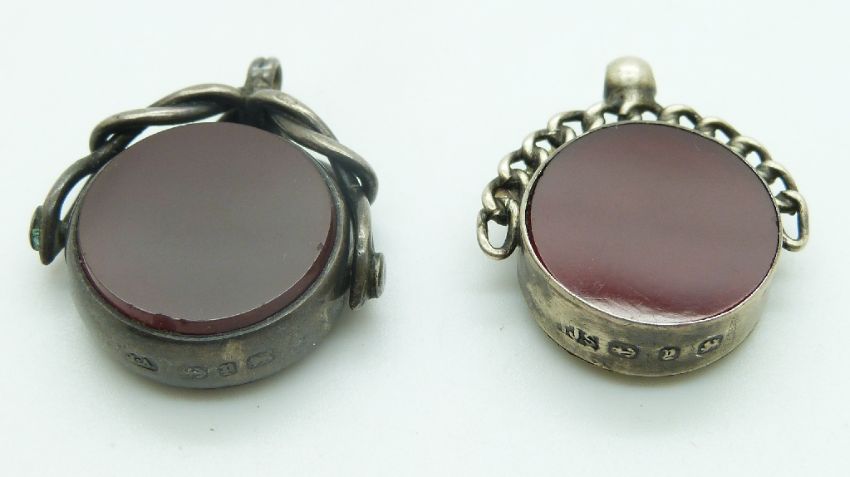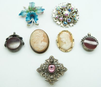 A silver brooch, two cameo brooches and a Victorian silver swivel fob,  a Victorian swivel fob set with a compass etc